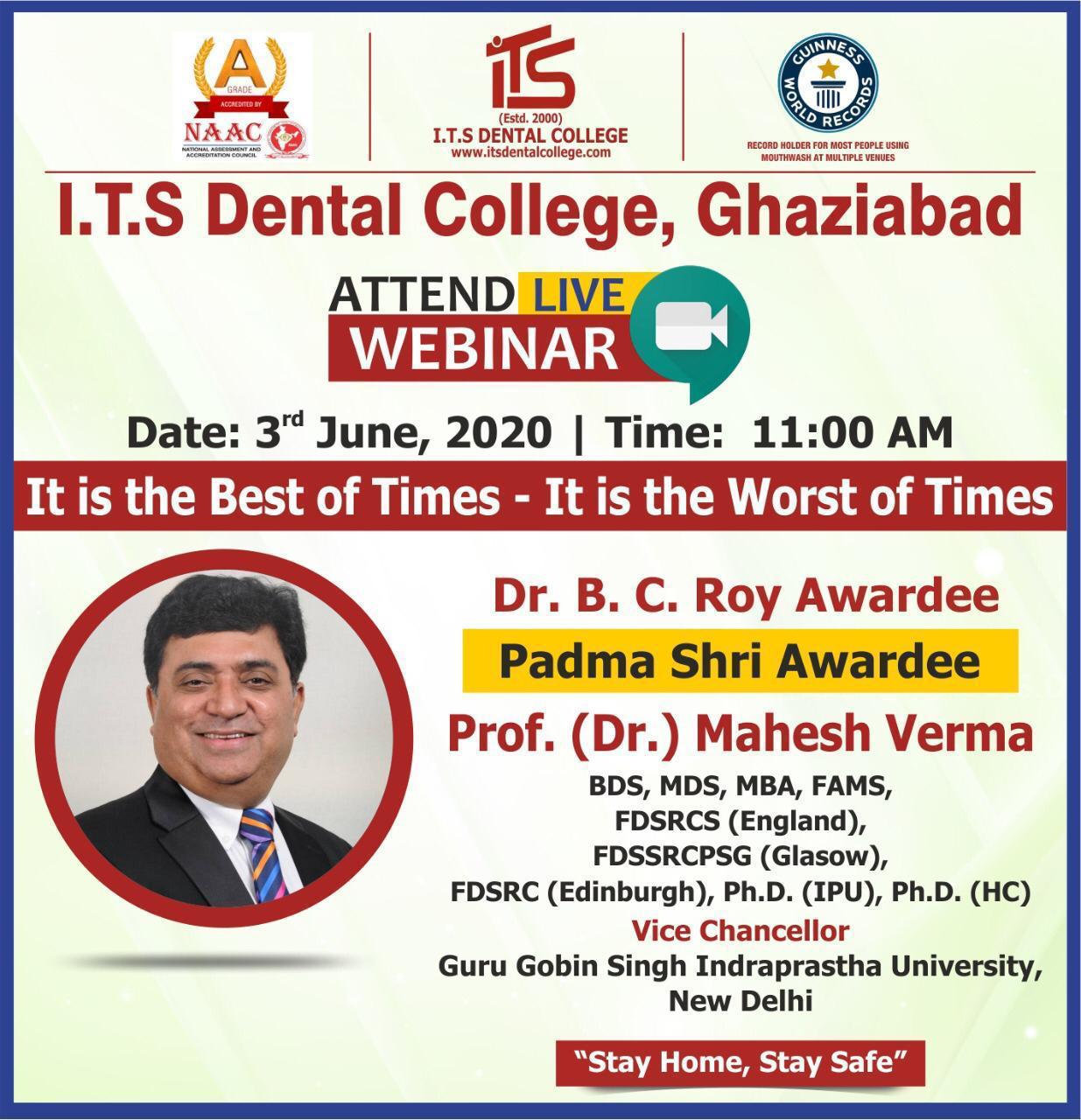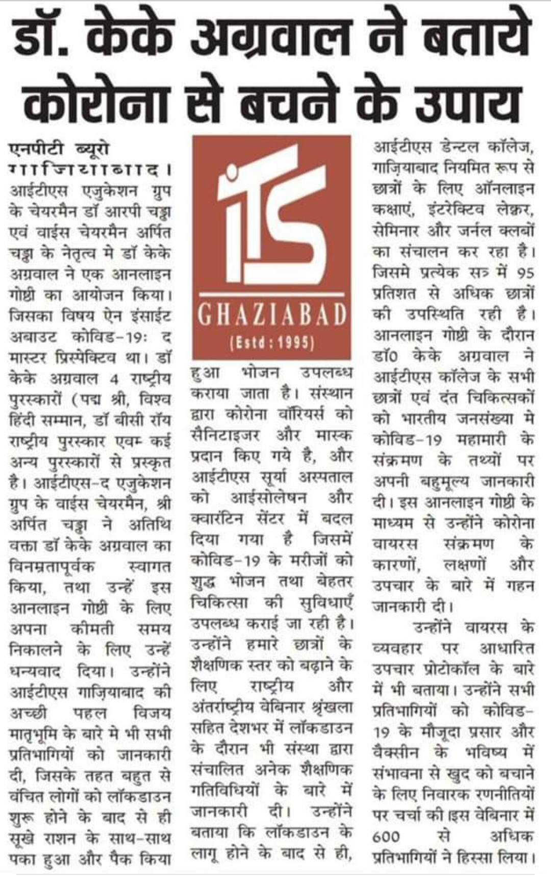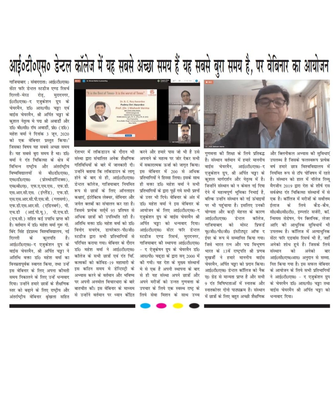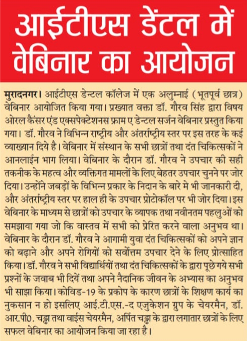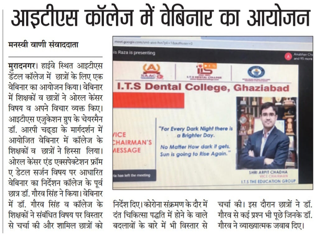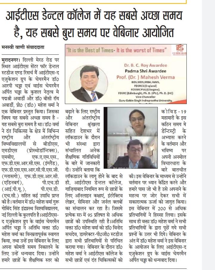 Massive press coverage of I.T.S Dental College Ghaziabad which hosted Padma Shri Awardee and Dr B.C. Roy Awardee, Prof.(Dr.) Mahesh Verma in a Webinar
