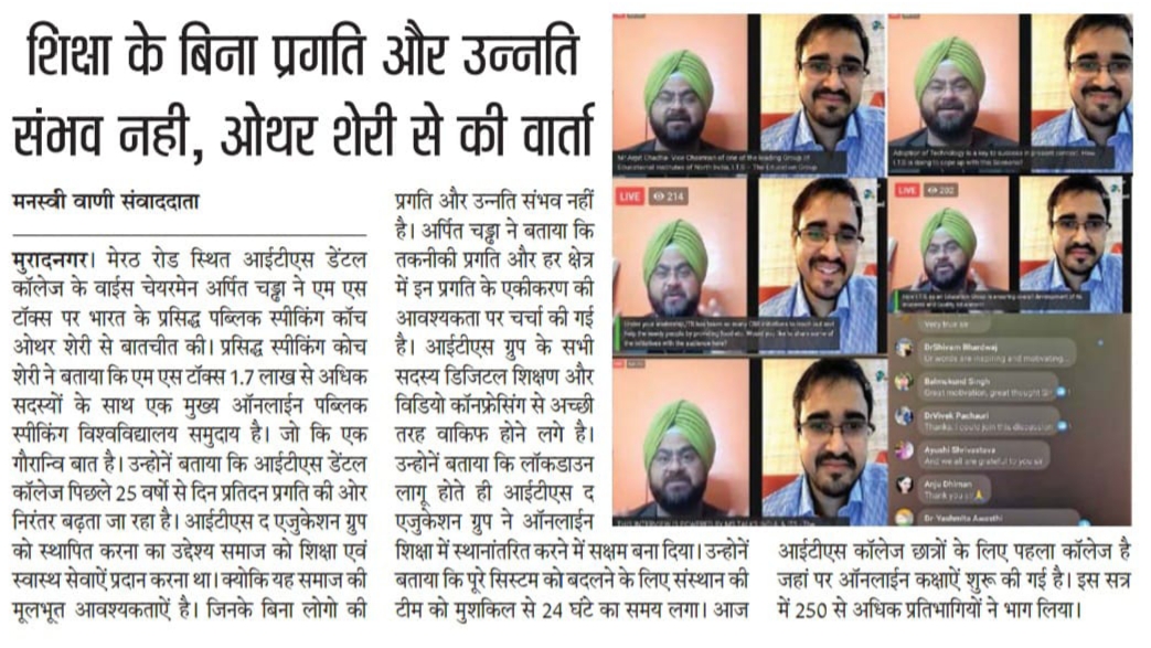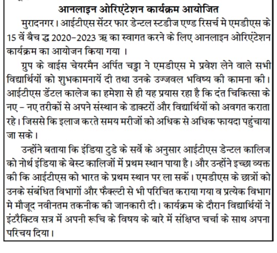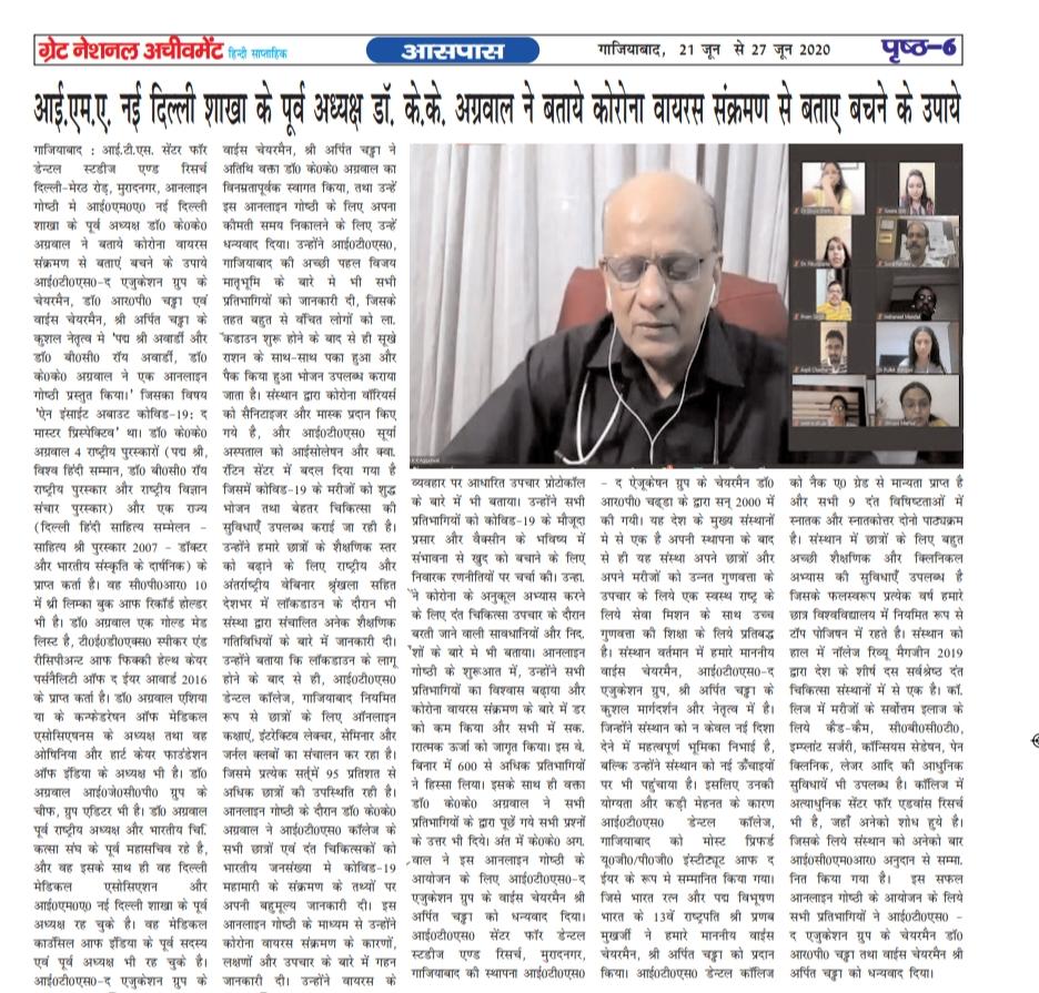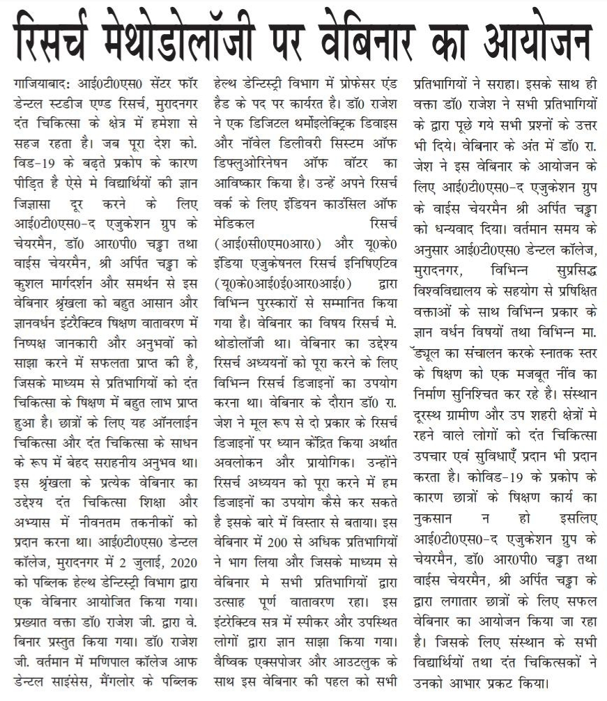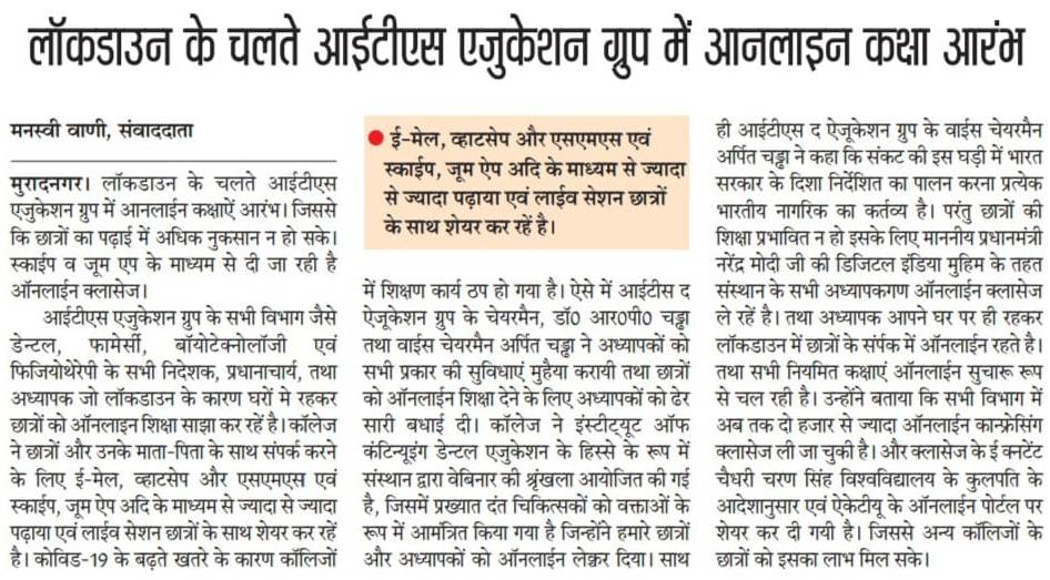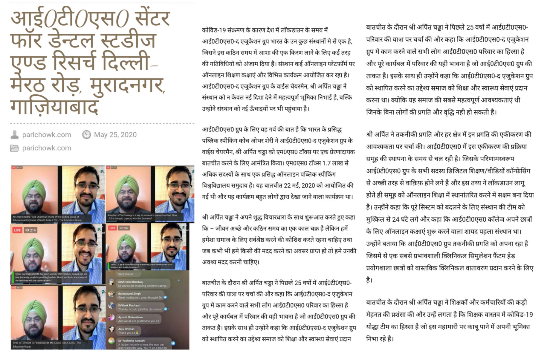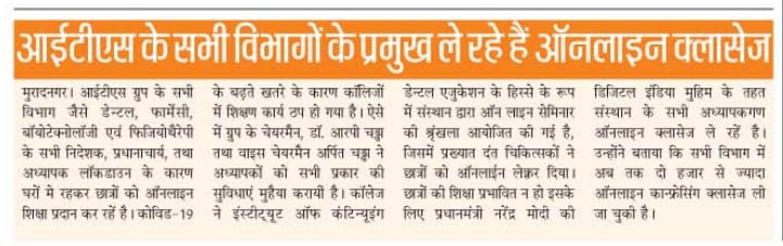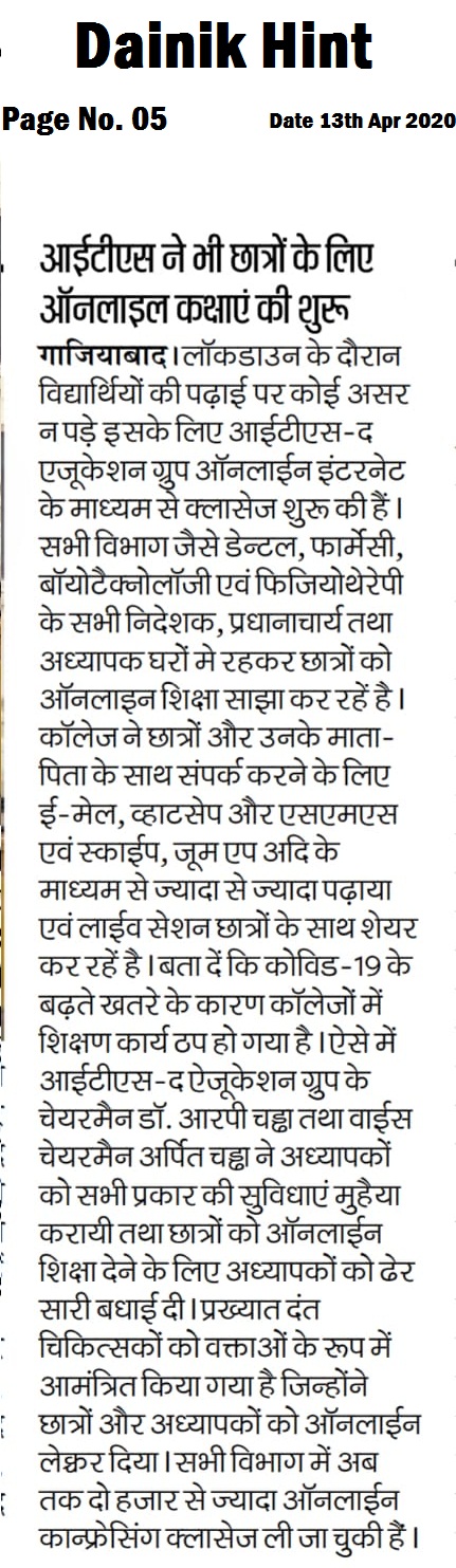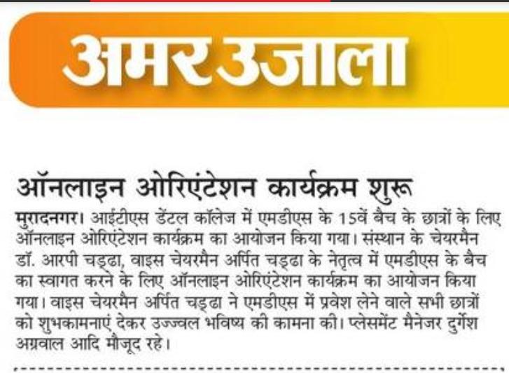 Massive press coverage of I.T.S Dental College Ghaziabad which hosted Padma Shri Awardee and Dr B.C. Roy Awardee, Prof.(Dr.) Mahesh Verma in a Webinar
