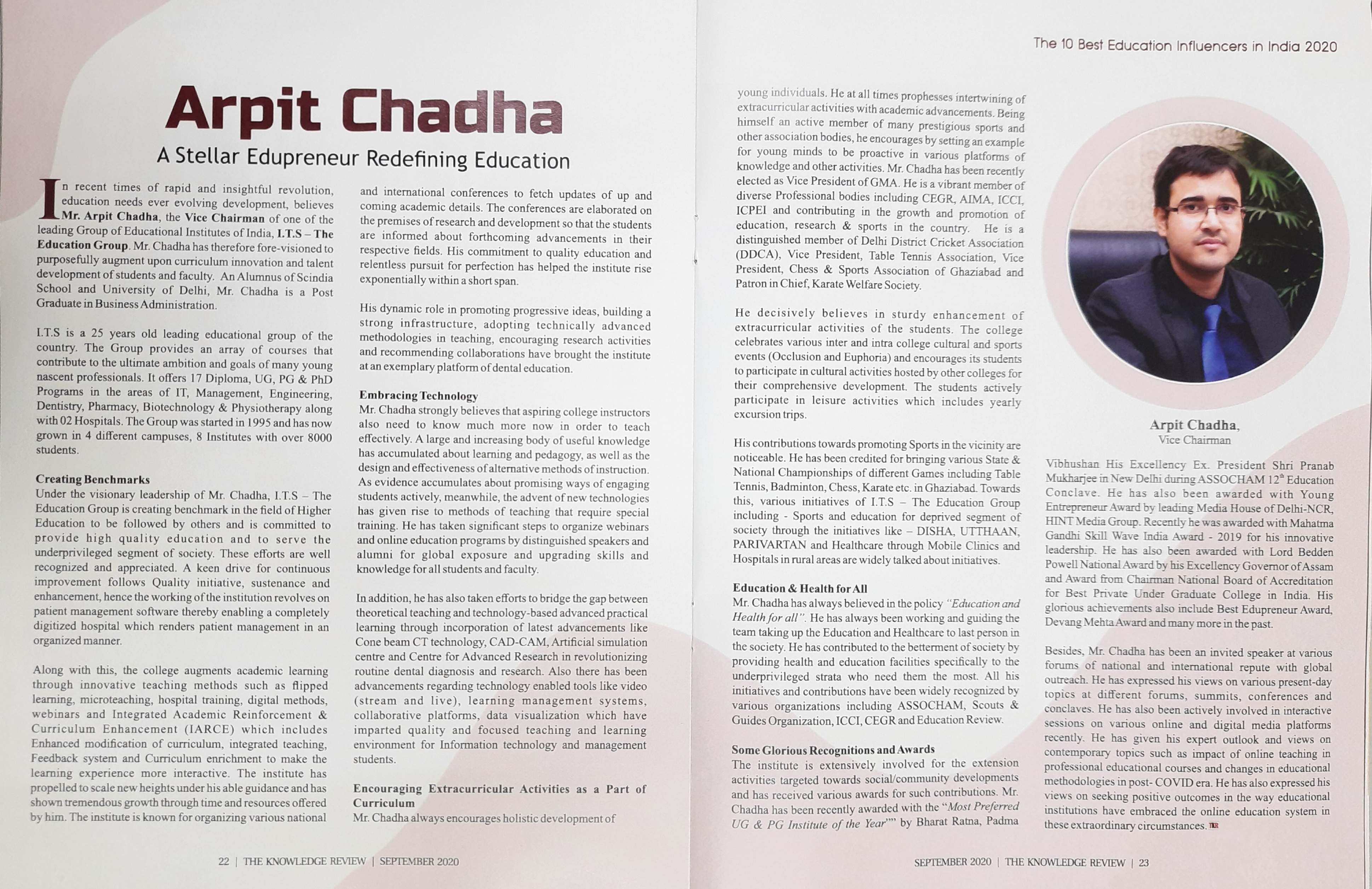 Honorable Vice Chairman, I.T.S-The Education Group, Mr. Arpit Chadha ranked among “The 10 Best Education Influencers in India 2020” by Knowledge Review Magazine