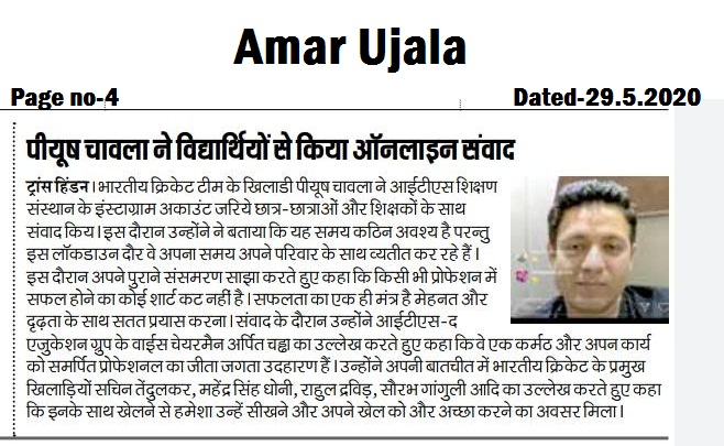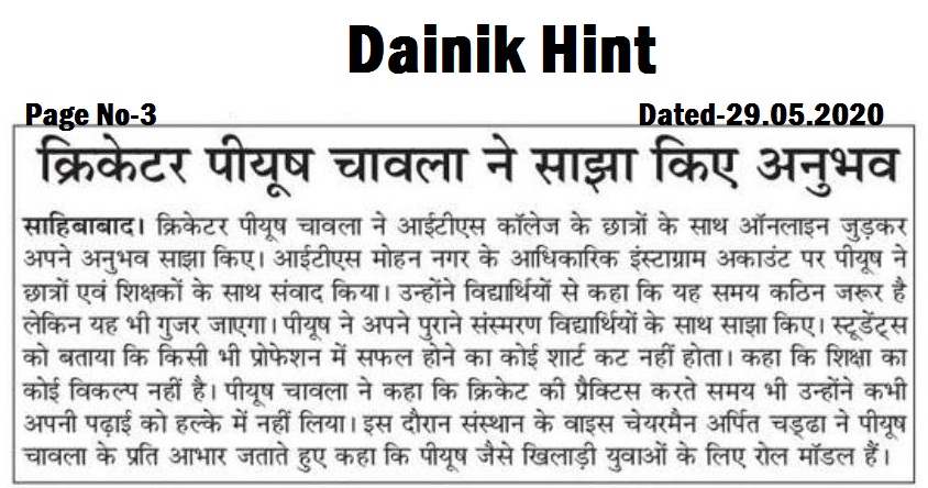 Huge press coverage of I.T.S Ghaziabad which recently hosted an online talk with the famous Indian Cricketer Piyush Chawla