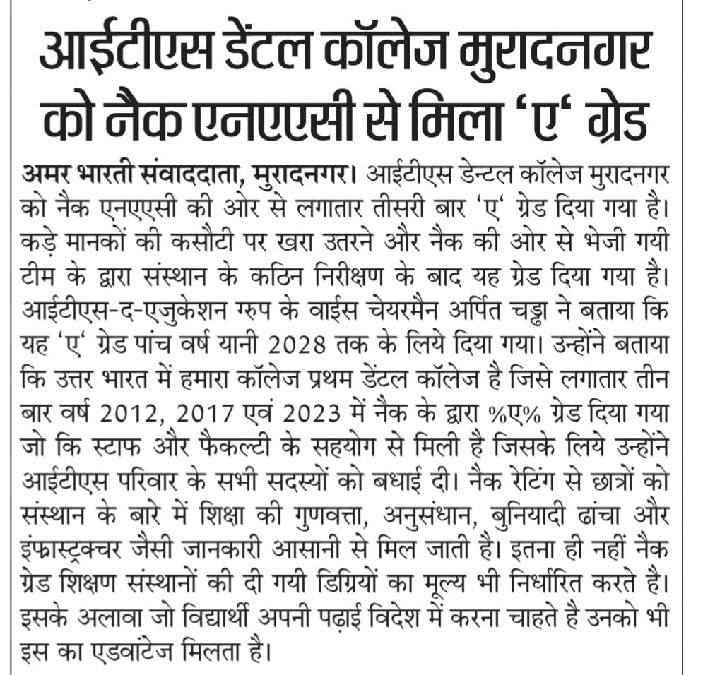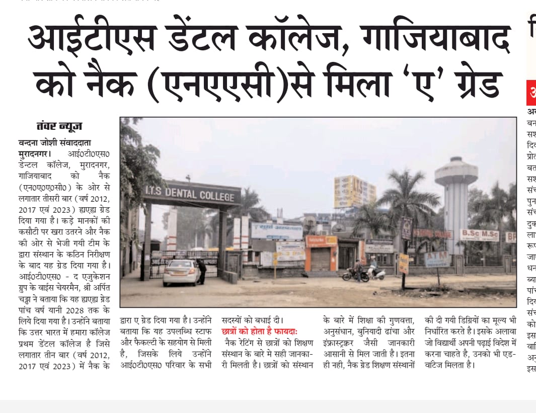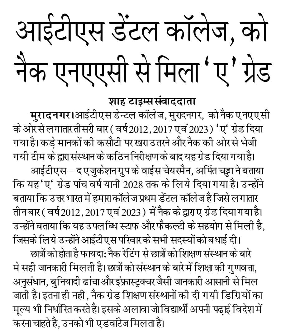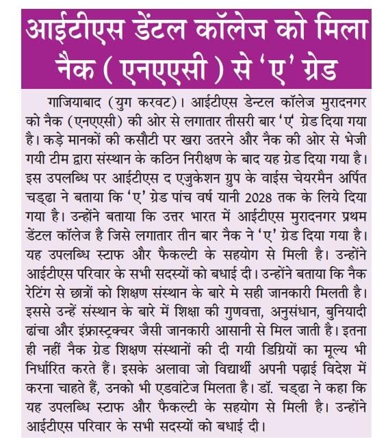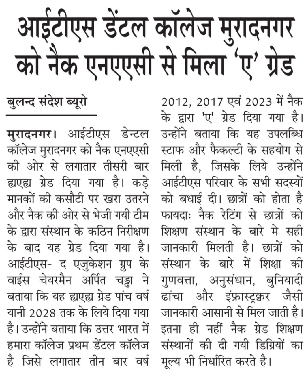 Media Coverage of I.T.S Dental College, Ghaziabad being Accredited with NAAC "A" Grade