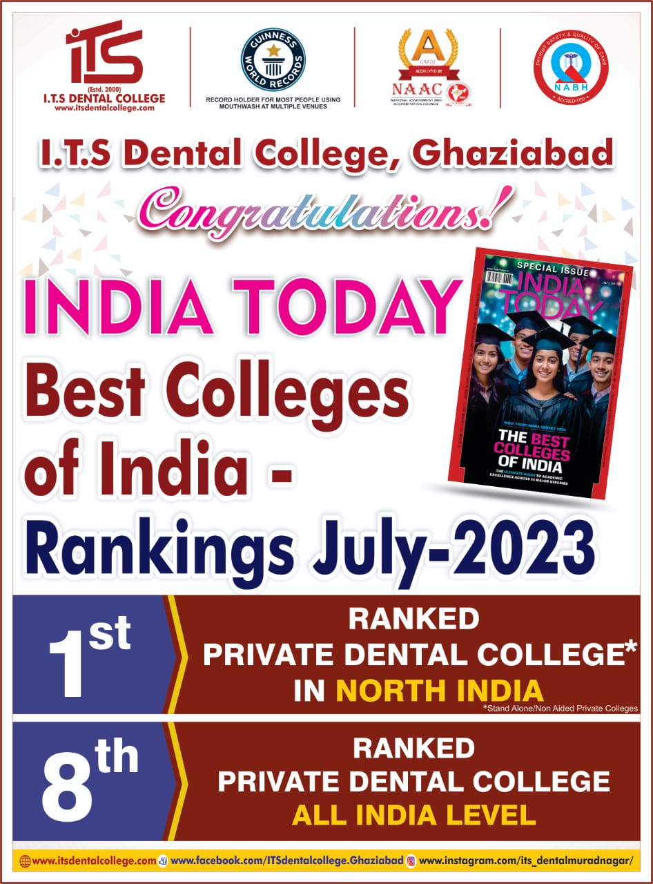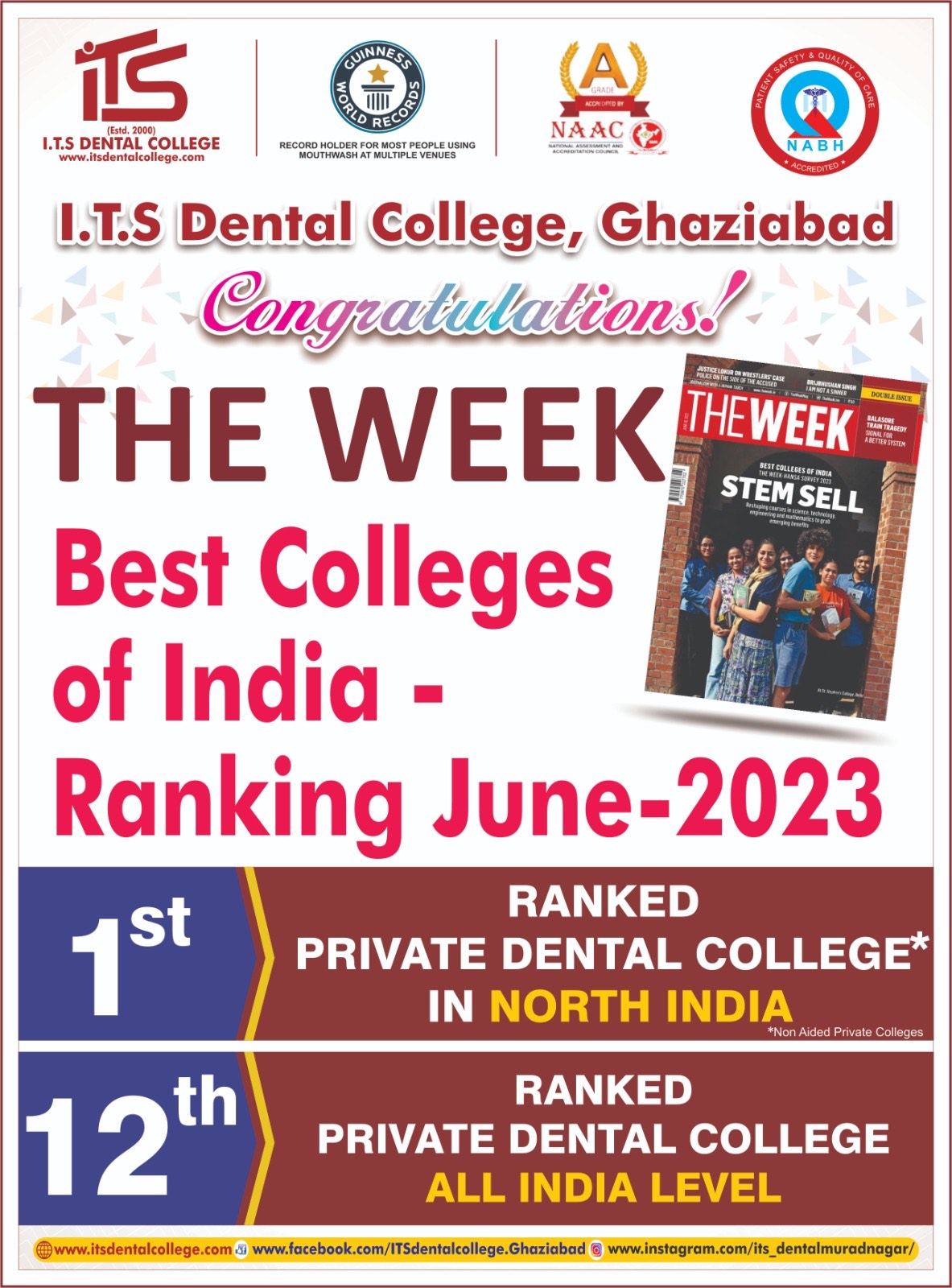 I.T.S Dental College, Ghaziabad has been been ranked 1st among Private Dental Colleges in North India in "The Week- Best Colleges of India Rankings June 2023".
