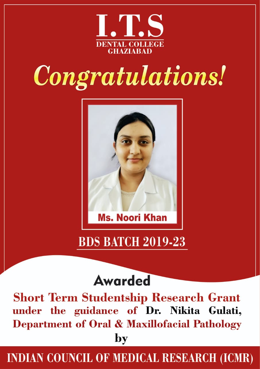 UG student Ms. Noori Khan has been awarded ICMR Grant Award