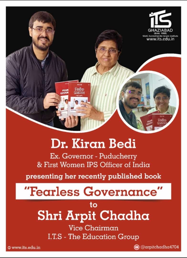 Dr.Kiran Bedi, Ex. Governor - Puducherry & First Women IPS Officer of India presented her recently published book "Fearless Governance" to Shri. Arpit Chadha, Honorable Vice Chairman, I.T.S-The Education Group